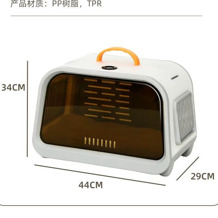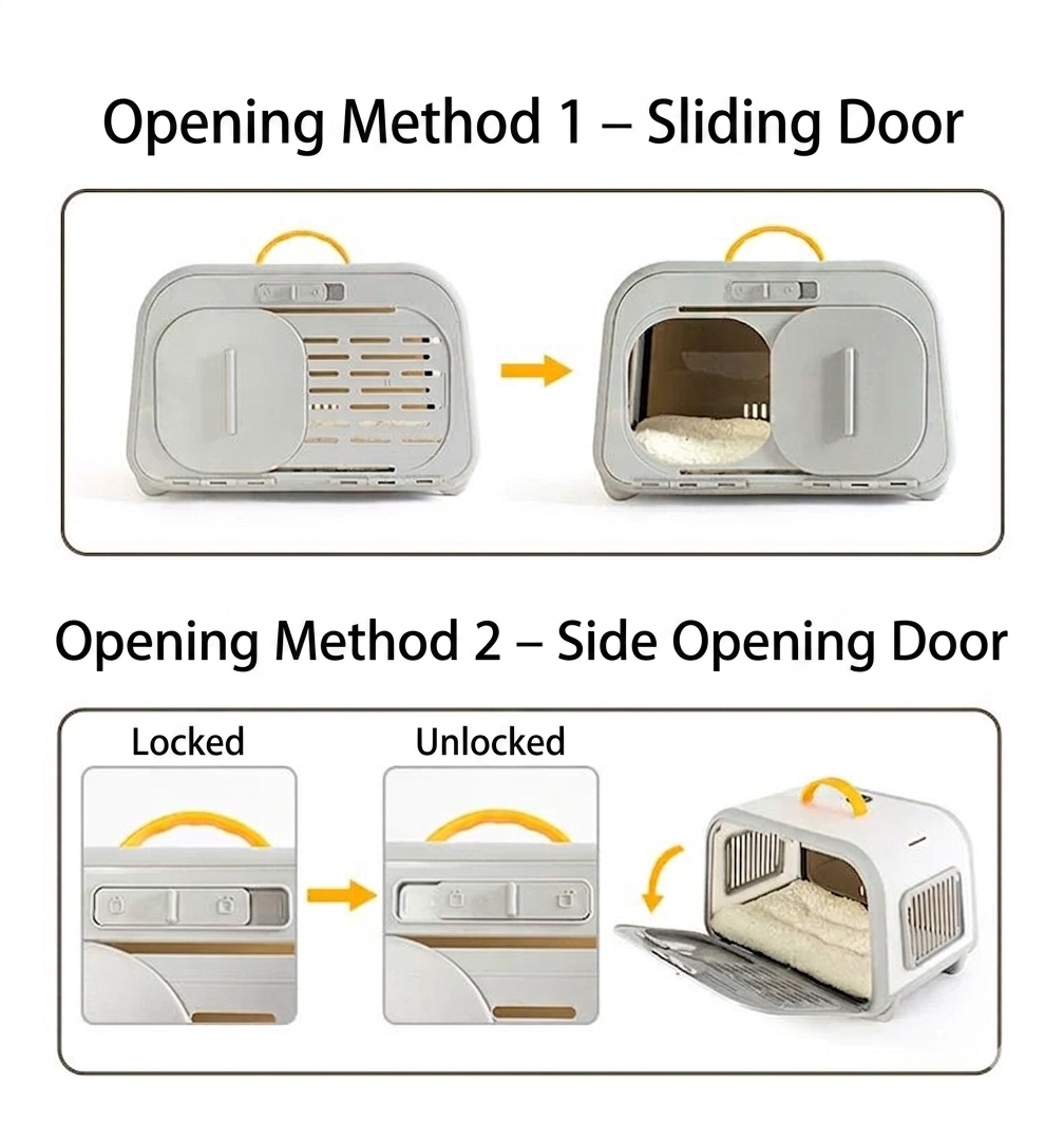 Opening Method 1 – Sliding Door: The entire front panel operates as a smooth sliding door. This creates a wide opening that allows your pet to walk in and out freely, making it excellent for use as a secure, semi-enclosed litter box in new environments. It’s also less intimidating for pets reluctant to enter traditional carriers.
